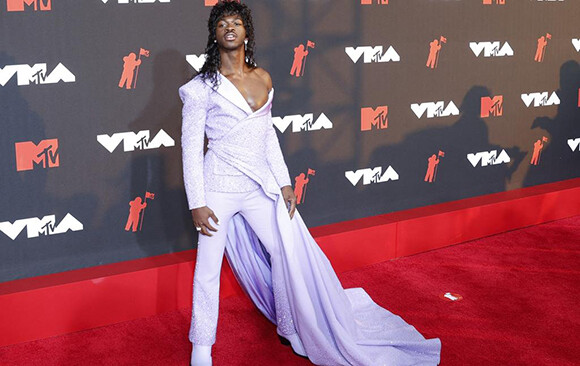 ライラックカラーのトレーン付きスーツでレッドカーペットに登場したリル・ナズ・X。(ニューヨーク、2021年9月12日) photo : Abaca