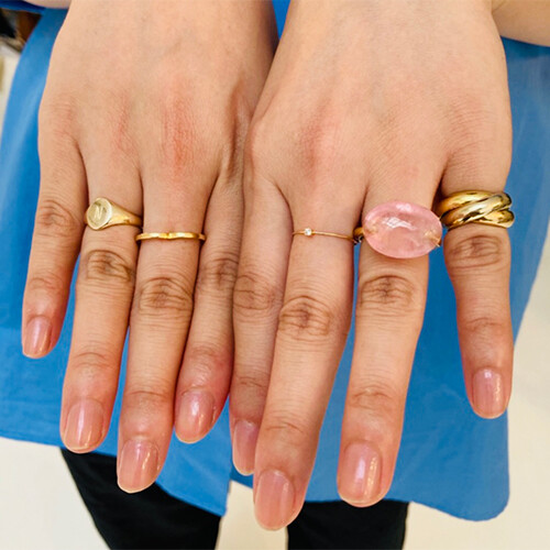 ジュエリーはゴールド派という清水さん。左手の小指につけたのはカルティエのトリニティ。シャルベのブルーのシャツに映える、マリーエレーヌ ドゥ タイヤックのピンクトルマリンの“カボション”リングは最近買ったもの。仕事中にも自然と目に入るリングは、そばにあるだけで心が落ち着くお守り的な存在だそう。左手の中指の華奢なリングはケイティヒリヤー。