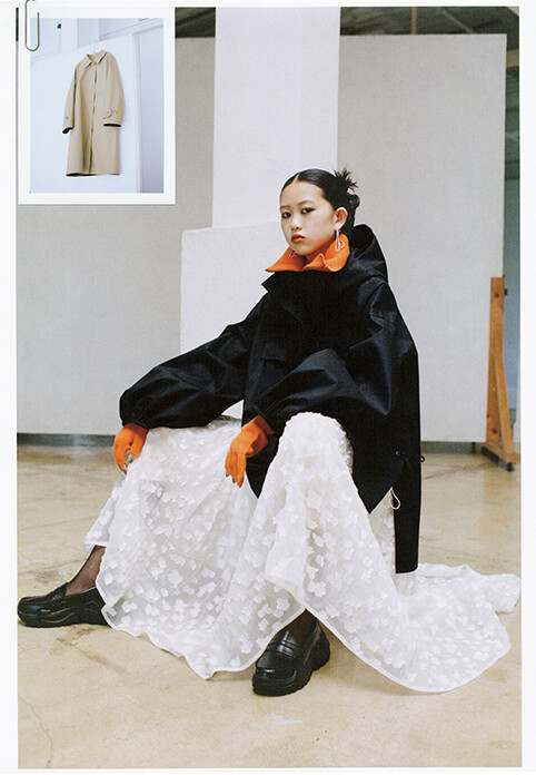 アノラック¥555,500/セシリー バンセン クラフテッド バイ マッキントッシュ(ドーバー ストリート マーケット ギンザ) スカート¥296,300(輸入関税込み、予定価格)/セシリー バンセン(ファーフェッチ カスタマーサービス) ネックウォーマー¥13,200、グローブ¥9,900/ともにジェーンスミス(アダム エ ロペ) ピアス¥20,900/ル シック ラディカル(フィルグ ショールーム) シューズ¥26,400/ヌーン バイ アキコアオキ(アキコアオキ) ソックス/スタイリスト私物 左上:ブランドを代表するステンカラーコート「バントン」¥179,300/マッキントッシュ(マッキントッシュ青山店)