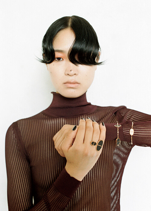 「シェーヌ・ダンクル・ヴェルソ」ブレスレット、左(ブラックセラミック×PG)¥804,100、右(ダイヤモンド×PG)¥1,144,000、リング(ブラックセラミック×PG)¥687,500、ニット(参考商品)/以上エルメス(エルメスジャポン)