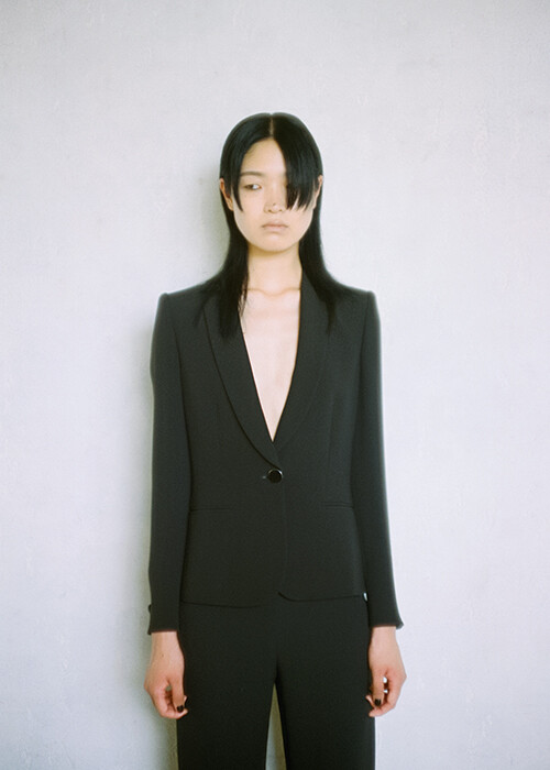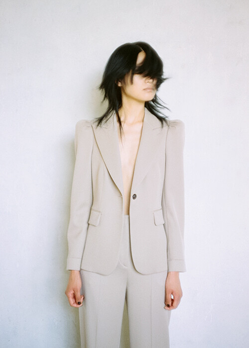 “女性の社会進出を手助けするための洋服を作りたい”。1970年代にジョルジオ・アルマーニが抱いた理想は、自らが生み出した芯地のないアンコンストラクテッドジャケットがベースの、メンズライクなシルエットを持つブラックジャケットとして結実。それから約50年を経て、80年代を思わせるパワーショルダーデザインを採用。パワフルでありながらフェミニニティを薫らせるベージュカラーとシェイプされたウエストラインに、いまも変わらないあの時の想いが宿る。