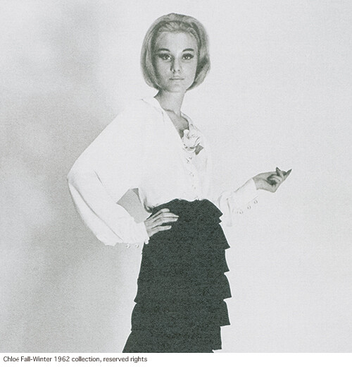 1960年代初めに発表された一着のシルクのブラウスが、その後もブランドのワードローブとアティチュードの象徴であり続けた。マスキュリンとフェミニンの両要素を持つエレガントなスタイルを標榜するクロエにとって、ブラウスは欠かせないアイテムだ。フロントとバックに施されたV字型のプラストロンと、繊細なプリーツのフリルが優雅に揺れる様がランウェイでもひと際印象的だった今シーズン。当時のロマンティックかつエフォートレスなスタイルが、ここに受け継がれている。
