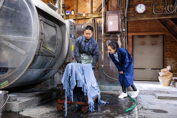 この日はちょうど4日経ったタイミングで、公則さんがドラムを開けて革を一枚ずつ取り出し、「馬」と呼ばれる道具に掛けていく。「重そうですね」と篠原さんが声をかける。「4キロあります。『馬』に掛けることによって水がよく切れて、革が乾きやすくなります」。一枚一枚を広げ、丁寧にシワを伸ばして掛けていくさまを、篠原さんはしばらく見守っていた。