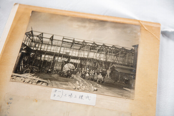 篠原さんたちがいる建物の上棟式の記念写真。「おじいさんが抱っこしている赤ちゃんが私です(笑)」と伊藤さん。