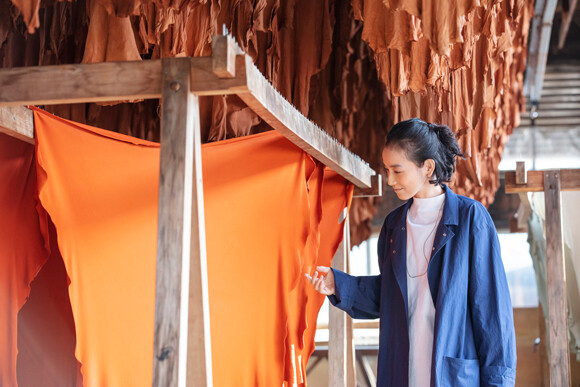 鮮やかなオレンジ色に染められたエゾ鹿革に触れる伊藤さんと篠原さん。まだ乾燥途中のため、しっとりとした感触だそう。「こうして自然にドレープが入っていくんですね」と篠原さん。