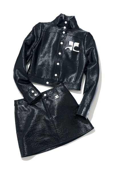 クレージュの中でもアイコニックなエナメルシリーズを、あえていま着るのもフレッシュに見えて素敵かなと思っています。でも、選ぶのは黒で少しシックに。ジャケット¥117,700、スカート¥50,600/ともにクレージュ(エドストローム オフィス)
