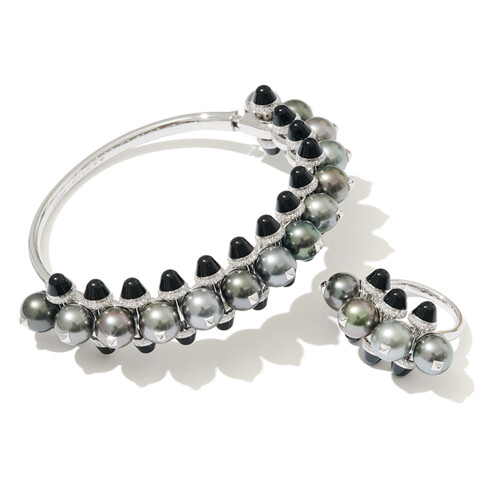 「“クラッシュドゥカルティエ”の静かな美しさとハードな印象のバランスに惹かれます」リング¥2,824,800、ブレスレット(ともにWG×タヒチパール×オニキス×ダイヤモンド)¥7,524,000(ともに数量限定モデル)/ともにカルティエ(カルティエ カスタマーサービスセンター)