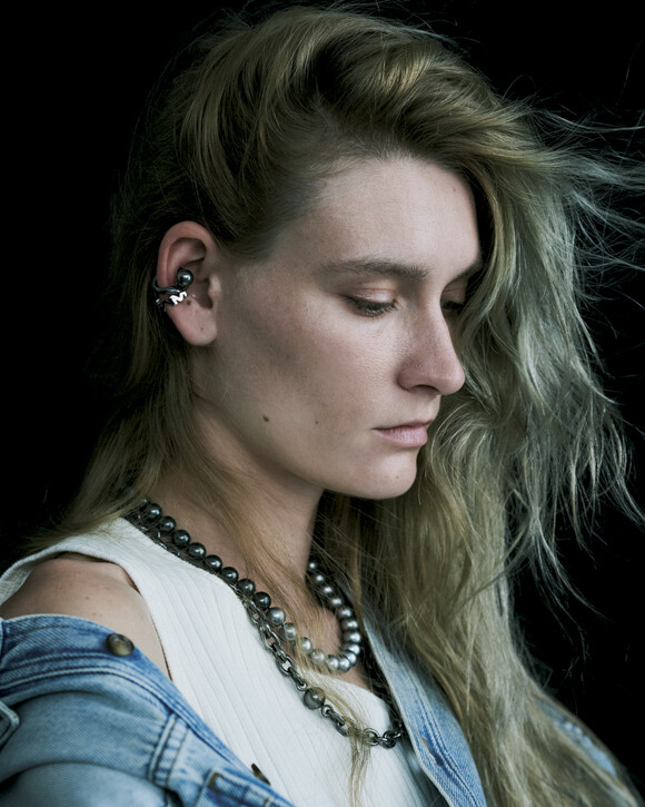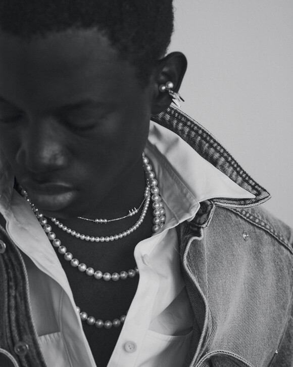 ネックレス上から(18KYG×あこや真珠)¥319,000、(SLV×あこや真珠)¥207,900、(18KWG×あこや真珠、2連で 着用)¥1,848,000、イヤカフ上(18KYG×あこや真珠)¥242,000、下(18KWG×あこや真珠×ダイヤモンド)¥385,000、リング人指し指(18KYG×あこや真珠)¥253,000、小指上から(18KYG×あこや真珠)¥506,000、(18KYG×あこや真珠)¥291,500/以上TASAKI シャツ¥72,600、パンツ¥91,300(ともに予定価格)/ともにワイプロジェクト(ザ・ ウォール PR)中に着たシャツ¥41,800、ブーツ¥132,000/ともにジョン ローレンス サリバン