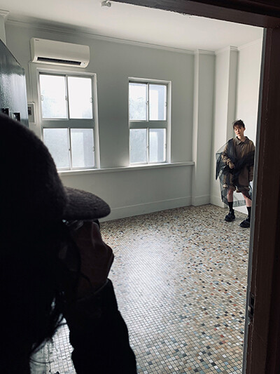 まずは昭和初期に建てられたという古い洋風のビルで撮影。カメラマンは高橋ヨーコさん。生田さんも大のお気に入りだったという、チュールのドレスがお似合いです。