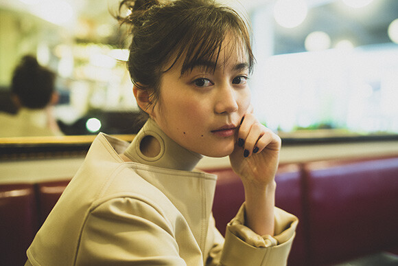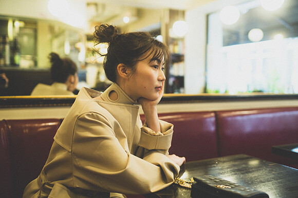 こんな大人っぽい表情も。デフォルメされたバーバリーの個性的なトレンチコートも素敵に着こなしてくれました。photography:YOKO TAKAHASHI