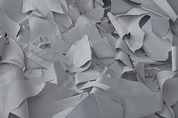 「革の端は本来、次の工程をスムーズにするために、ある程度カットせざるを得ないのが現状です。問屋さんやメーカーサイドでも、傷がなく見た目がよいほうが使い勝手がよいとされてきました。これまでにも、カットした革を色出しのために再利用したり、学校の先生が生徒たちの工作用に引き取ってくれたりすることはありましたが、今回このような形で、アート作品に生かすことができたのは大きな発見でした」