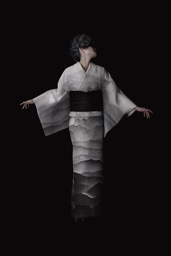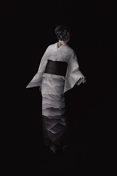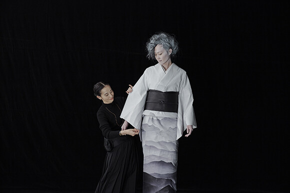 ヘア&メイクアップアーティストの稲垣亮弐さんも、昨年度に引き続き撮影に参加。黒髪が背景に溶け込む境界にハイライトを入れたいという話が出た時、篠原さんはきもののグラデーションを職人がスプレーガンで一枚一枚つくりあげてくれたことを稲垣さんに伝えた。記事No.05に登場した、ベテラン職人の桐原義雄さんとの制作の日々が脳裏に浮かんだのだろう。稲垣さんはスプレーを使い、霧がかかったような神秘的なニュアンスを表現。桐原さんの卓越した技術力と誠実な仕事への、篠原さんたちからのオマージュのようだった。