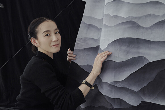 「今回の作品は、各ジャンルの職人さんにたくさんのお力をいただき、一から色をつくり、カットし、貼り合わせて、丁寧に丁寧に時間をかけてつくっていきました。どのくらい時間がかかるんだろう、と思うほど途方もない挑戦でしたが、ようやく完成させることができて、ほっとしています。イメージしていた以上の、水墨画のような世界が目の前に広がって……この美しさは、革そのものの魅力があるからこそ生まれた景色なのだと思っています」