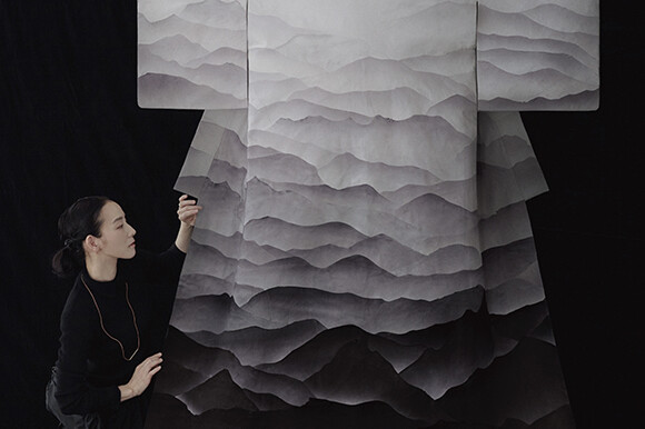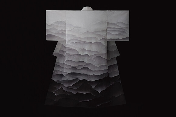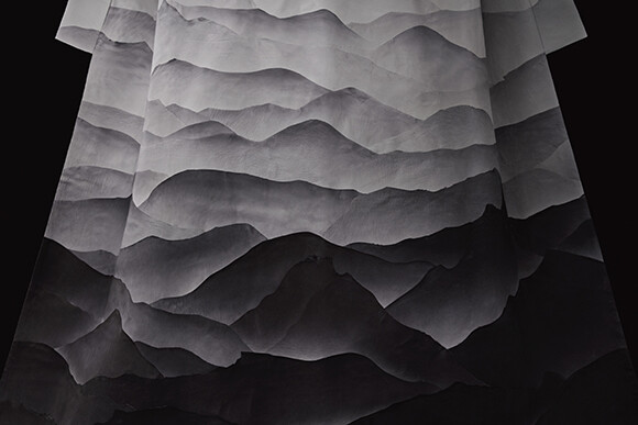 革の端を山の稜線に見立てて水墨画の風景を表現した、篠原さんの革のきものがついに完成。