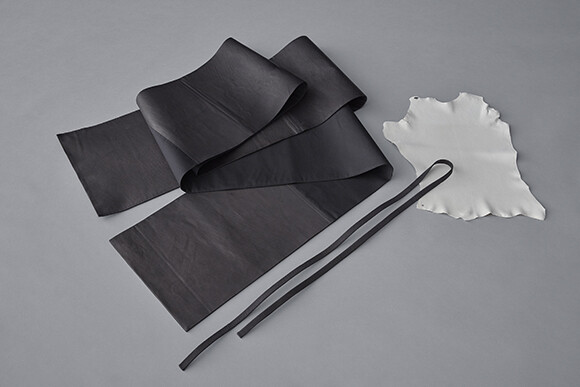 帯(左)と帯締め(中)は、きものと同じエゾ鹿革で制作。色はきものの最も濃い黒に合わせた。右はキョンの革。きものの革と同じ0.45mmの薄さに漉き、数枚を縫い合わせて半衿に。「帯や半衿は、どれも厚さや幅がちょうどよく、今日のコーディネートにはベストでした」と本多さん。