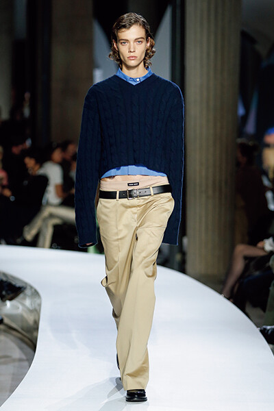 チノパン、ケーブルニット、シャツというごくありふれたベーシックなアイテムをこんなにもフレッシュに見せるミュウミュウはやはり素晴らしい。ミウッチャ・プラダによる、女の子が大好きなものが詰まった素敵なコレクションに毎シーズン感動します。ずり下げた腰パンや見せパン(!)は懐かしくて、学生時代にやっていました、と思わず手を挙げたくなりました。今季のマストバイはチノパンに決定です。