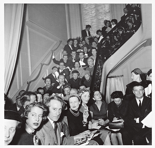 30番地のサロンで行われていたオートクチュールのショー。椅子席のゲストに加え、階段にもぎっしりとメゾンにゆかりの人たちが詰めかけた。1950年頃の写真には、ムッシュ ディオールの友人だったジャン・コクトーも。