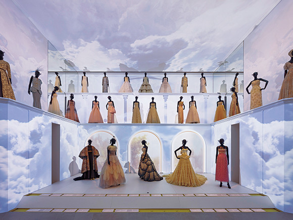 ムッシュ ディオールは、子どもの頃から仮面舞踏会に魅せられていた。シーズンごとに彼が世に送り出したドレスは、まさにオートクチュールの夢を形にしたもの。そのエスプリはもちろん後継者にも引き継がれ、マリア・グラツィア・キウリも、初めてのオートクチュールで仮面舞踏会にインスパイアされたコレクションを発表した。以来、毎シーズン美しいドレスが発表されている。高い天井を生かした展示室では、天使の舞う絵画から雲の浮かぶ空、星座の輝く夜空など、多彩に表情を変える幻想的なプロジェクションを背景に、ディオールのドレスが舞踏会を繰り広げる。歴代クリエイションが一堂に会し、時代を超えたディオールのスタイルを体感できる空間だ。