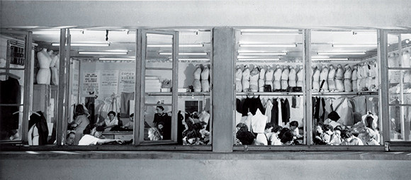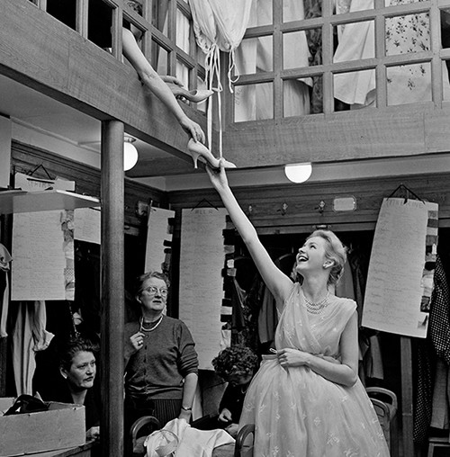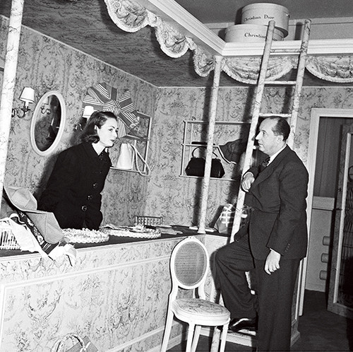 ムッシュ ディオールの時代の姿のまま扉を閉ざされ、手つかずで残されていたキャビン(楽屋)。30番地のサロンでオートクチュールのショーが行われていた時代、モデルたちはここで準備をし、着替えてサロンへと歩みを進めた。決して広くないキャビンゆえに、ボリュームのあるドレスは中2階に収納され、下にいるモデルたちに上から手渡されたという。下のモノクロ写真は1957年春夏オートクチュールコレクションの様子。トリアノン ドレスの着用を準備中のモデルのドゥニーズが、中2階からパンプスを受け取っているのがわかる。このキャビンが残されていたフロアはブティックのある2階だったので、ギャラリーの展示順路のどこに入れ込むかが悩みどころだった。ナタリー・クリニエールは「3階のムッシュ ディオールのオフィスと一緒に見せたかったので、床に開口を設けてガラスをはめ込み、上から覗き込んでもらうことにしました」とレイアウトの工夫を語った。