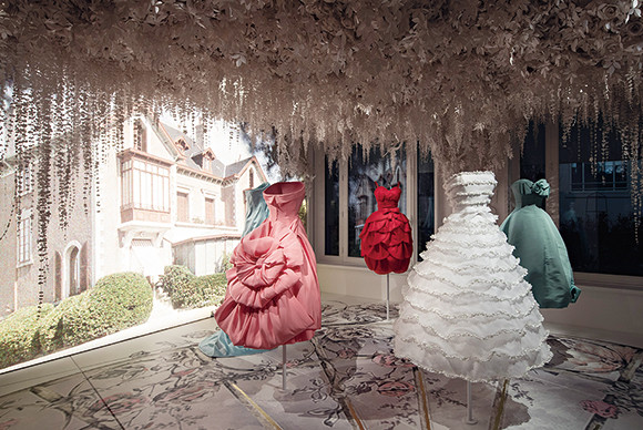 ムッシュ ディオールとメゾンの創生期を語る最初の展示室「クリスチャン・ディオール1905–1957」に続き、夢の世界に見学者を誘うのは、「魔法の庭園」。ムッシュ ディオールの花への愛は、ノルマンディのグランヴィルで育った子ども時代に生まれた。それは彼のクリエイションに大きなインスピレーションを与え、初期には花びらのように膨らんだスカートに代表される「ファム フルール」のシルエットを生む。シルエットだけではない。プリント、刺繍、布地による造形まで、花をモチーフにした表現は、メゾンのスタイルを語るに欠かせないテーマ。歴代アーティスティック ディレクターの手によって、時を超え、場所を変え、常に見えない糸のようにクリエイションを繋ぎ続けてきた。展示では、紙細工の花々をちりばめて昼の庭園、夜の庭園を演出。ライティングの微妙な動きで、ドレスはまるで庭園を散策する女性たちのような生き生きした表情を見せる。
