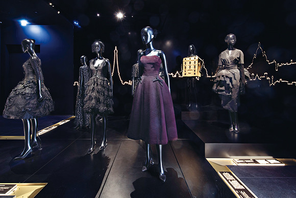 「パリの空気はクチュールの空気だ」と、ムッシュ ディオールは語っている。パリとパリジェンヌは、彼にとって尽きることのないインスピレーション源。パリジェンヌのプティットローブノワール(黒いプチドレス)をスタイルのマニフェストだと見なしていた彼は「昼の女王たち。栄光、ミューズ。私たちが望み、愛し、崇める女性たち。エレガントな女性たち。“パリジェンヌ”……」という言葉も残している。オットマン、レース、レザーなど、さまざまな表情を見せる黒、ミッドナイトブルーやパープルのドレスたちは、シックなカクテルソワレを思わせる。エッフェル塔やサクレクールが光のラインで浮かび上がるパリの夜景のデザインを背景にして展示されている。