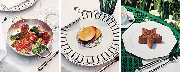 料理は右から、ムッシュ ディオールのシンボル、星をかたどったショコラのスイーツ「Tarte au Chocolat」、彼がドーヴィルで初めて食べたという好物のキャビアを加えた卵料理「OEuf Christian Dior」、ムッシュの故郷ノルマンディでたくさん水揚げされるヒラメの一皿「Turbot à la Cubaine」