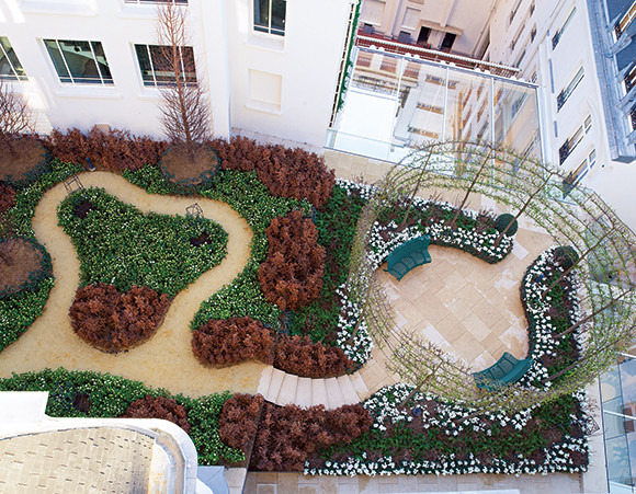 創設者が愛したリンゴの木とバラのある庭園は4階に。