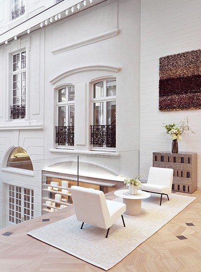 創業時代から受け継がれるエスプリを感じさせる場所がギャラリーなら、伝統と革新を融合し、エレガントでありながらダイナミックないまを体現したのがブティック。19世紀の邸宅の流れを汲む新古典様式と現代のピュアなラインの融合は、建築家ピーター・マリノの仕事だ。