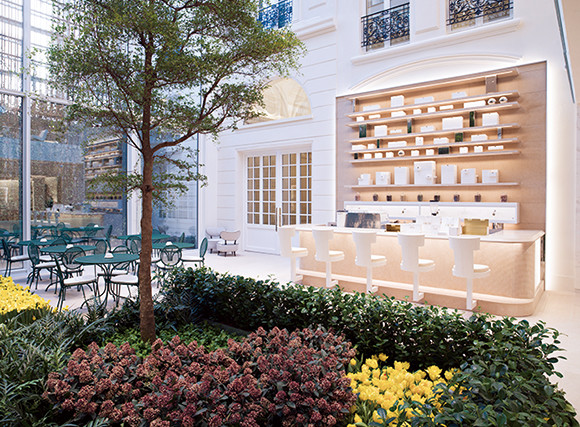 中庭を望む1階と2階に、レストランとパティスリーがあるのも見逃せない。パリで最も話題のシェフ、ジャン・アンベールが提案するのは、グルマンだったムッシュ ディオールにちなんだメニュー。彼はヘリテージ部門に通い、ムッシュの著書『La Cuisine Cousu-main(手縫いの料理)』や、故郷ノルマンディの味やメゾンのコードを解釈して、伝統と現代が溶け合うこのアドレスにふさわしい料理を提供する。ディオールのロマンティックなテーブルウェアで楽しむ食事も、パリ好きにとって旅のメインの目的になりそうだ。