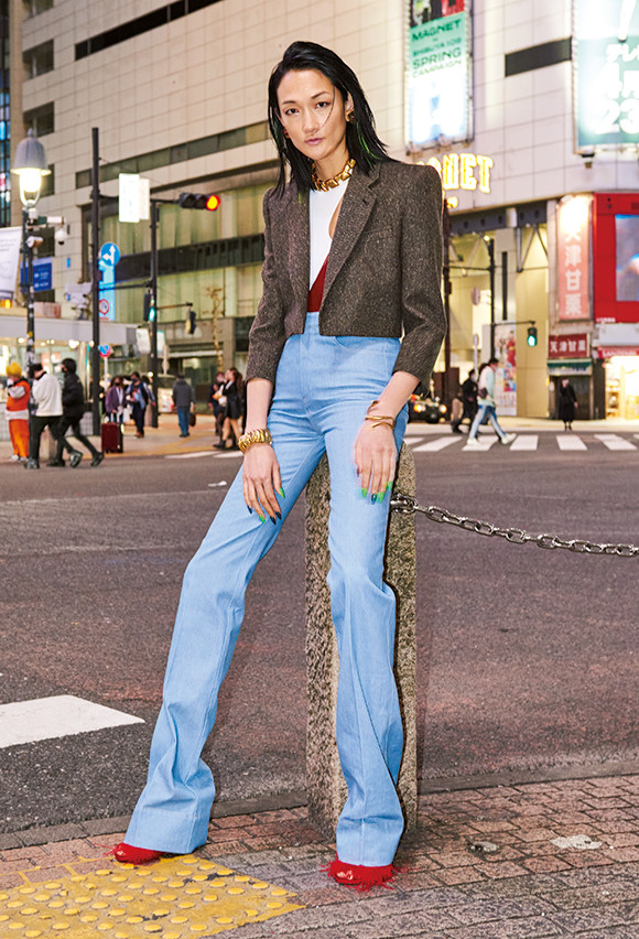 フィット&フレアなデニムのシルエットに、クロップト丈のジャケットをさっと羽織る。フロントにファーをあしらったミュールで、00年代風をトッピング。ユース向けという印象のあるY2Kも、こんなムードで纏えば大人も取り入れやすい。
