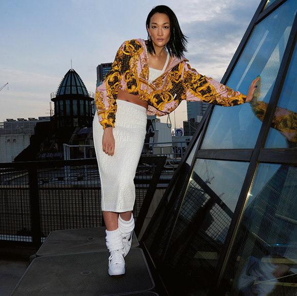 ブルゾン¥264,000(予定価格、5月中旬発売予定)/ ヴェルサーチェ バイ フェンディ、セットアップ¥242,000(予定価格、5月中旬発売予定)/フェンディ(ともにフェンディ ジャパン) イヤリング¥940,500/カルティエ(カルティエ カスタマー サービスセンター) レッグウォーマー¥1,540/インテルメッゾ(シルビア 新宿サブナード) スニーカー¥16,500/ナイキ スポーツウェア(ナイキ カスタマーサービス)