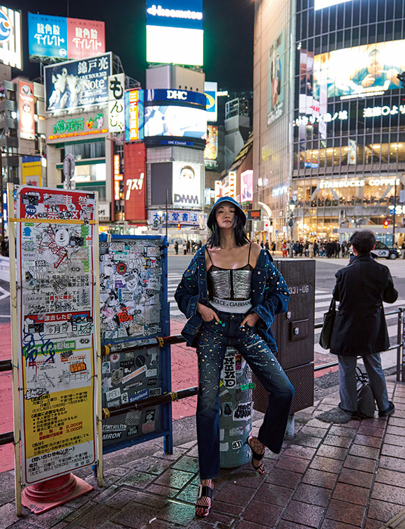 いま再燃する00年代ファッション。このムーブメントは、無数の可能性と明るい未来への期待でキラキラと輝いていた、パワフルなあの時代への憧憬だろうか。40歳を迎える冨永愛が、Y2Kスタイルに身を包み、渋谷の街を再び闊歩する。