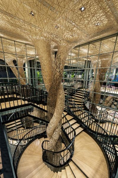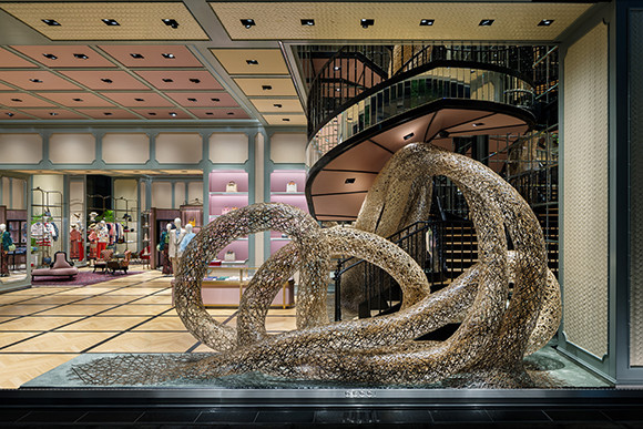 去る4月29日に1周年を迎えた銀座のフラッグシップショップ、グッチ並木では、グッチを象徴するバンブーをテーマに、竹を用いた作品で国際的に注目を集めるアーティスト四代田辺竹雲斎の作品を公開中。ショップの1階と2階を繋ぐ螺旋階段の空間に展開したインスタレーションが圧巻だ。伝統を表す黒竹と未来を表す白竹で編まれたダイナミックで有機的な複数の竹の構造体は、重なり合いながらひとつになって螺旋階段から天井へと広がり、伝統を守りつつ現代的な要素を取り入れて進化を続けるグッチの未来への歩みを具現化。