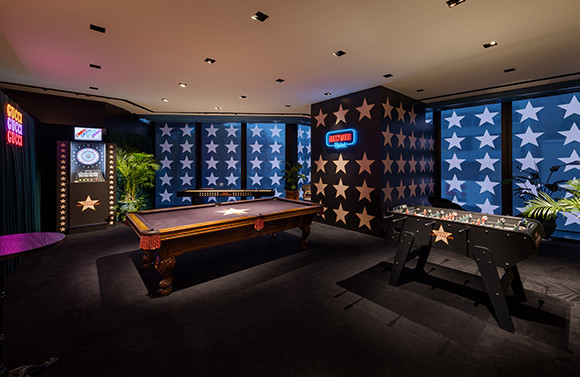 映画撮影の待ち時間にスターたちが集っていたことを思わせるレトロなゲームルーム。Images Courtesy of Gucci