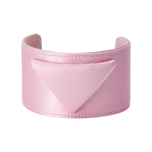 ブランド名を配さず、あえて象徴的なトライアングルのみをあしらったユーモアたっぷりのアクセサリー。太めのバングルも柔らかなペールピンクで女性らしいムードに昇格させて。バングル(シルク)¥55,000(予定価格)/プラダ(プラダ クライアントサービス)