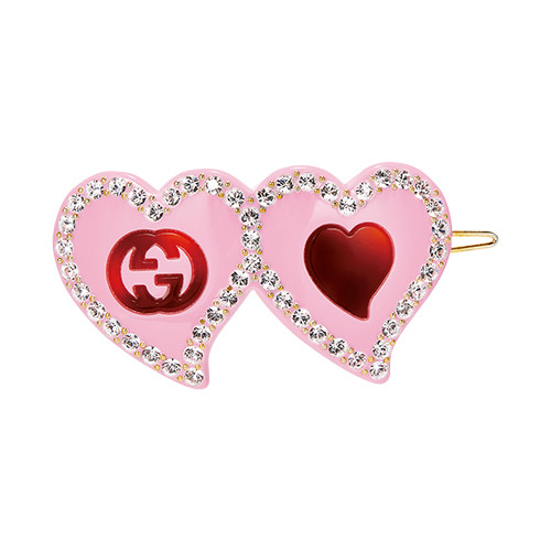 トレンドカラーのピンクは洋服、ジュエリーのみならず、ヘアアクセサリーにまで波及。ハートモチーフにきらきらと輝くクリスタル、そしてピンク。女性の“好き”だけをぎゅっと詰め込んで。ヘアクリップ(レジン×クリスタル)¥53,900/グッチ(グッチ ジャパン)