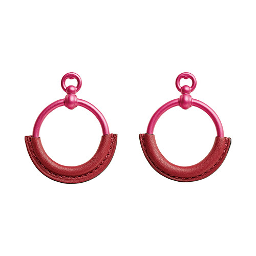 エレガントかつシックな印象の「ループ」が、落ち着いたトーンのピンク色に染まって。ミニマルでグラフィカルな“トグルクラスプ”のデザインに大人の遊び心を足し算している。ピアス「ループ」(アルミニウム×カーフ)¥103,400/エルメス(エルメスジャポン)