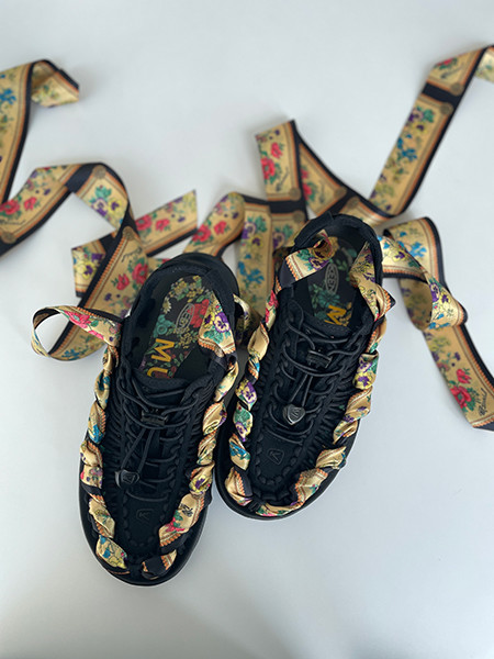ヴィンテージライクでミュベールらしさがひかるサテンのリボンに惹かれて、この春、キーンのアイコニックなUNEEKと夢のコラボを果たしたサンダルを迎え入れました。