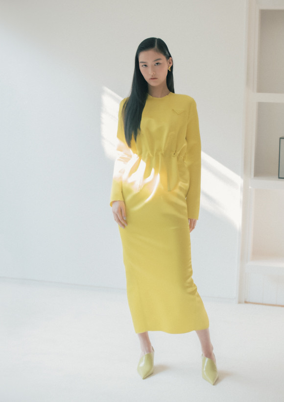 汐谷友希が着るのは、陽の光のように眩しいイエローのシルクドレス。ウエストのギャザーでシルエットに変化を加えたペンシルラインのドレスが似合うのは、171cmという抜群のスタイルと透明感を併せ持つ彼女だからこそ。