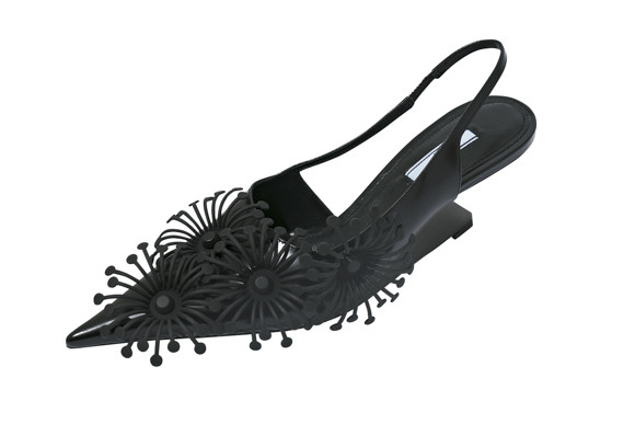4. 立体感のある造形が美しい花のパーツを咲かせた、ノーブルな佇まい。ミュール(ヒール6.5cm)¥187,000(予定価格)/プラダ(プラダ クライアントサービス)