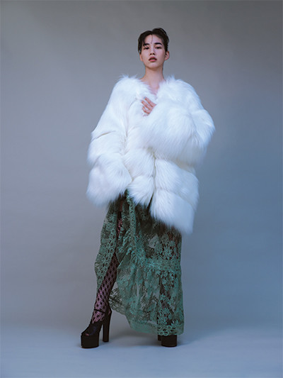 ファーコート¥1,155,000、ドレス¥935,000、ソックス¥23,100、シューズ¥143,000 /以上グッチ(グッチ ジャパン)