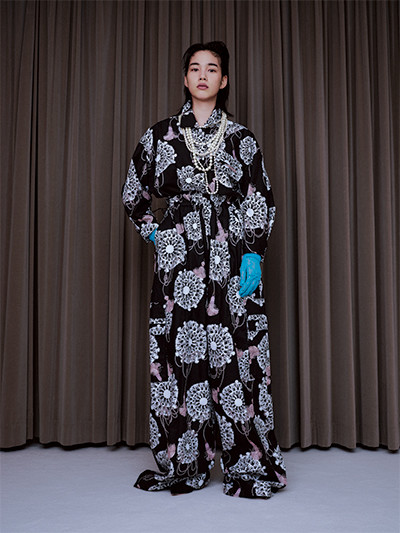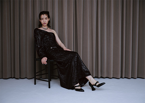 2022年春夏コレクションによせてヴィルジニー・ヴィアールはこう話している。「私はいつも、そこはかとなくロマンティックで、ちょっとしたミステリーを感じさせるものが好きなのです」。女優のんが今回纏ったのは大胆なワンショルダー、そして幾千ものスパンコールが輝くブラックドレス。まさにロマンティックでミステリアスなムードが似合う、大人の女性を体現した。