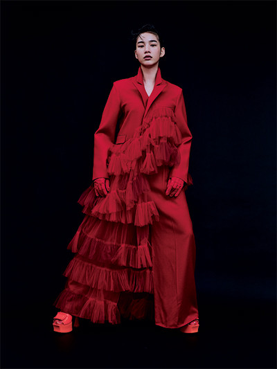 もしも大人の女性がチュールを嗜むなら。甘くなりすぎないよう、あえて1枚で潔く着こなしたい。ジャケットとパンツをドッキングしたようなジャンプスーツに、無数のフリルをティアード状にあしらって。美しい赤は、ロマンティックにもクールにも表情を変える。