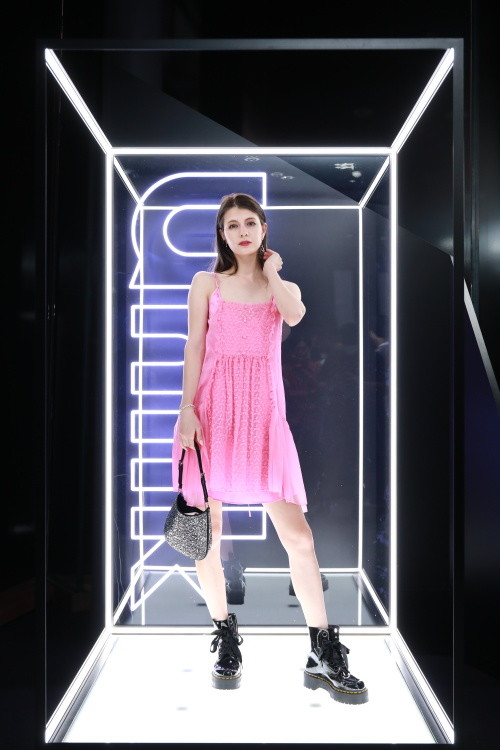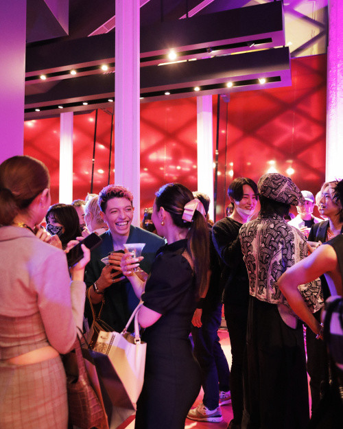 DJの音楽が止まると、地下のステージには鮮やかなオレンジ色のドレスに身を包んだミュージシャンのBENIが現れた。階段上の客席に観客が集まり、盛り上がりはピークに。熱気に包まれた地下フロアでは、続いてファッションショーも行われた。ファッションユーチューバーとして活躍するハズムによる「経年変化の、その先にあるもの。DAN」や、ユニークな演出が際立った、スケバンのようなスタイルを披露したユーチューバーめぐによる「KANAME」、21年アジア ファッション コレクション 9thにて最優秀賞を受賞した「COCOTONO」の3ブランドがランウェイに。