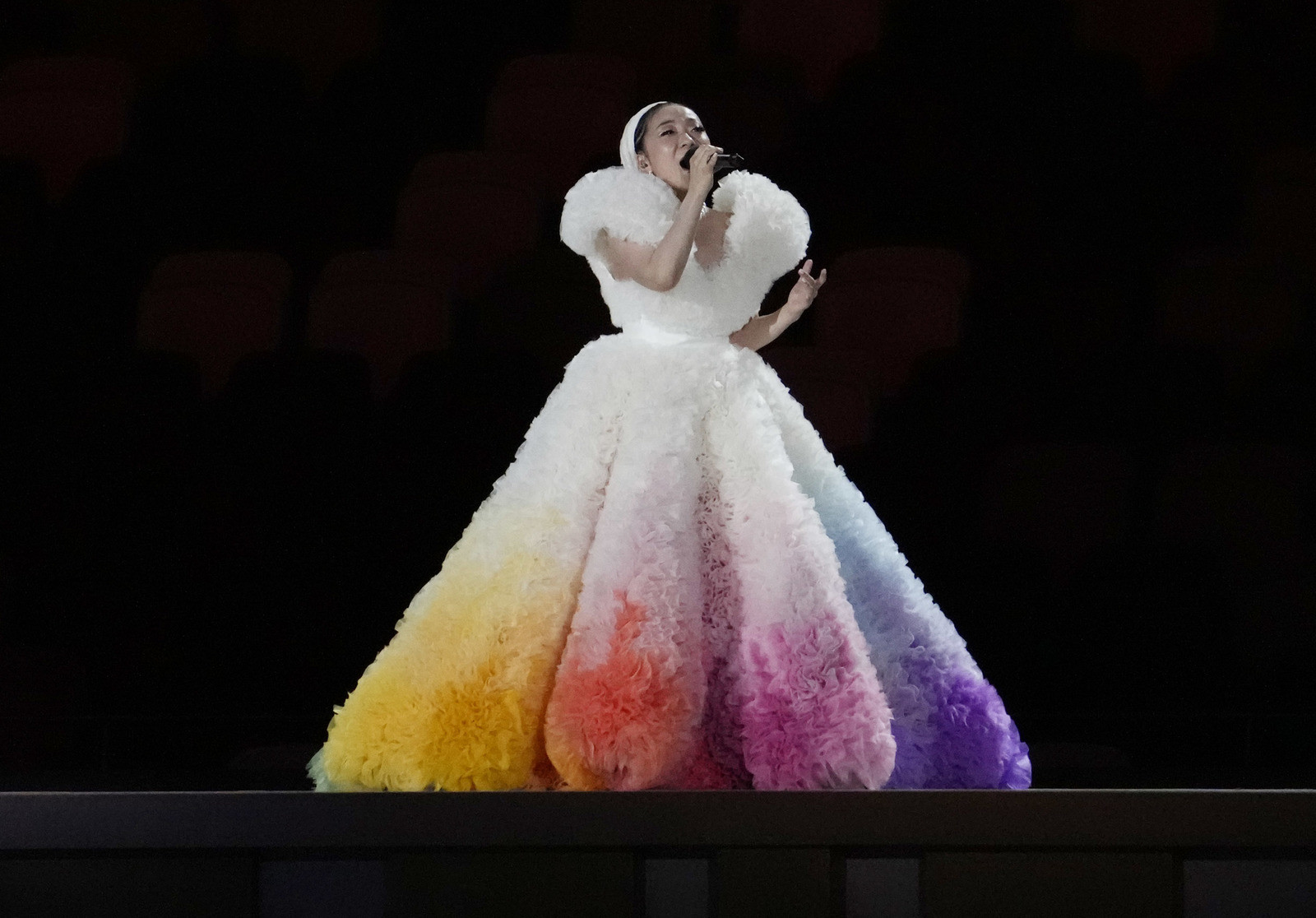 東京2020大会開会式で国歌斉唱するMISIAさんのドレスは小泉さんが担当した。Photo: Reuters/AFLO