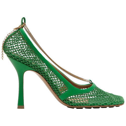 鮮やかなグリーンに染め上げたメッシュとカーフレザーに、華奢なチェーンがキラリ。