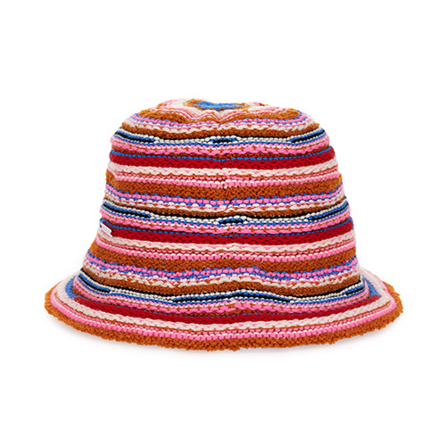 多彩な糸を丸編み機で編み上げることで、細く不規則なボーダー模様に仕上げたピースフルなニット帽。