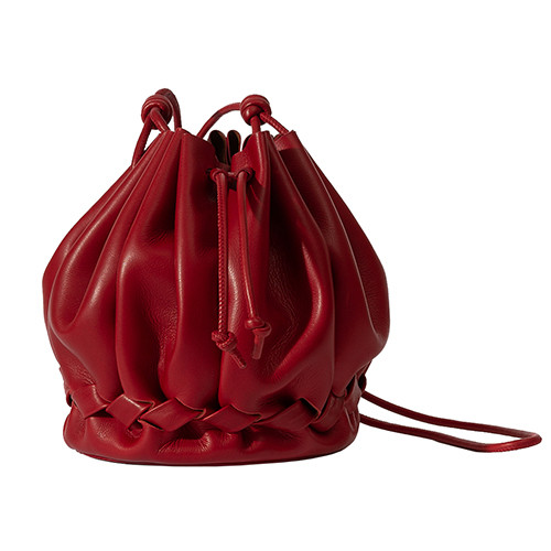 丹念な編み込みディテールや美しいギャザーの陰影を引き立てる、真紅に染め上げたカーフレザー使いが秀逸。