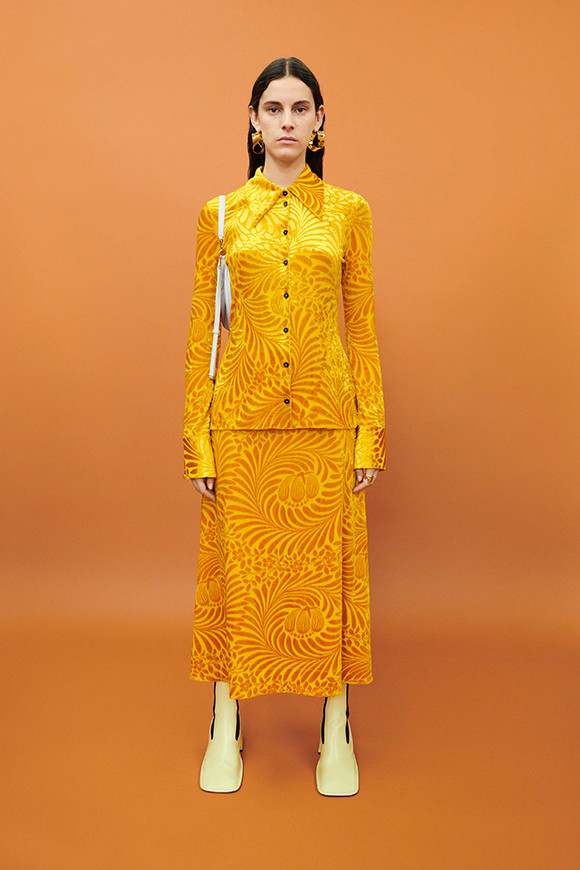 フラワーモチーフをデヴォレ加工により浮かび上がらせたベルベットのセットアップ。深みのある山吹色が毛足のあるテクスチャーによってさらに際立つ。