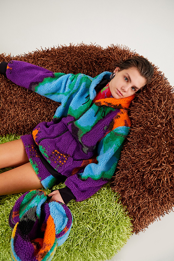 パーカ¥97,900、ミニスカート¥49,500、トップ¥396,000、イヤリング(参考商品)、バッグ¥39,600/以上エムエスジーエム(アオイ)